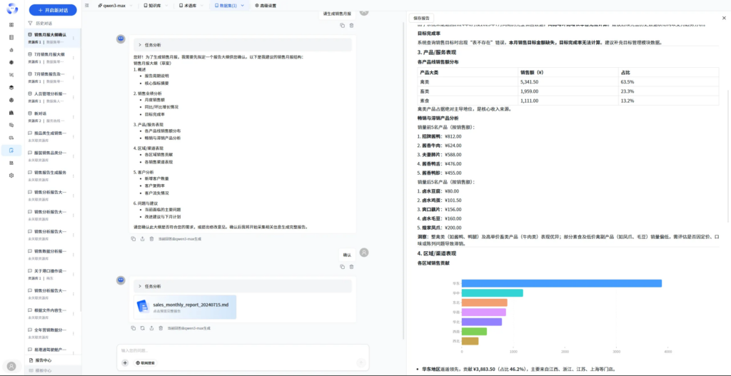 • 分析报告: 支持基于平台数据资产自动撰写并生成业务分析报告。