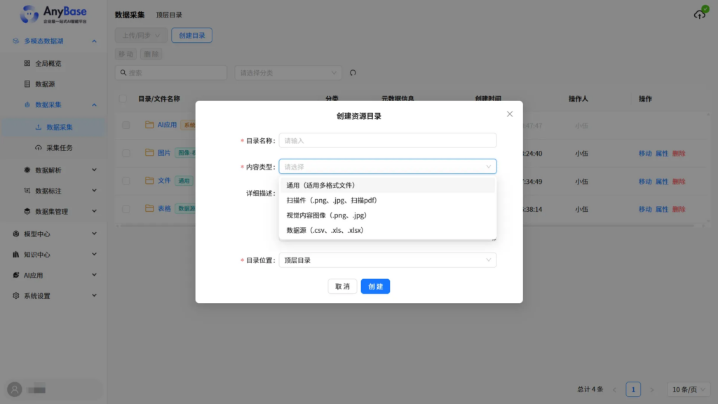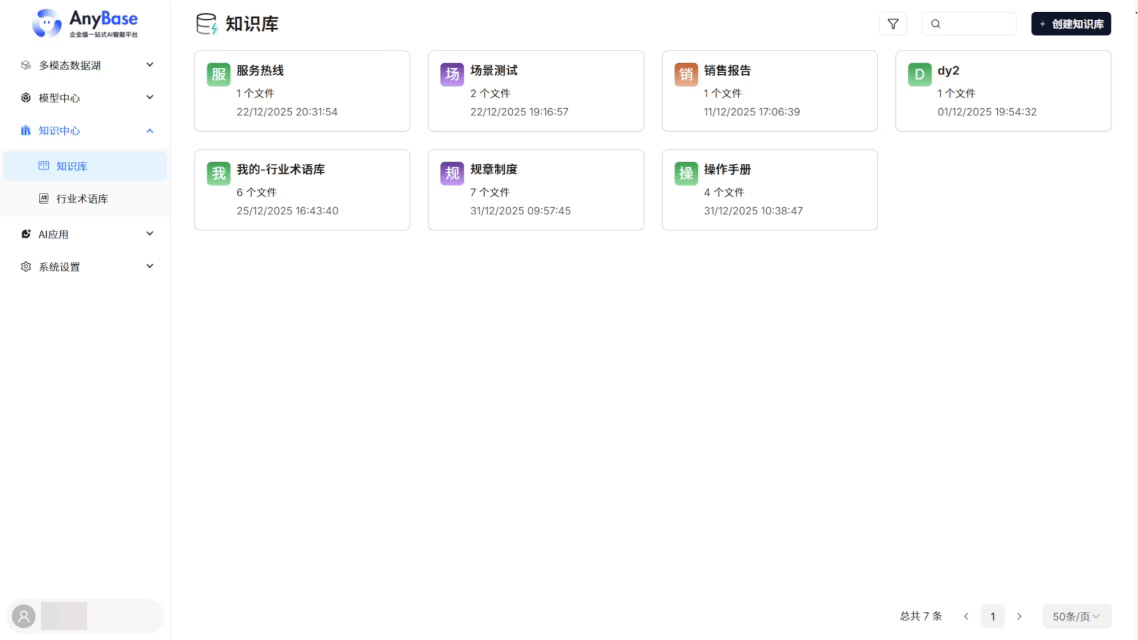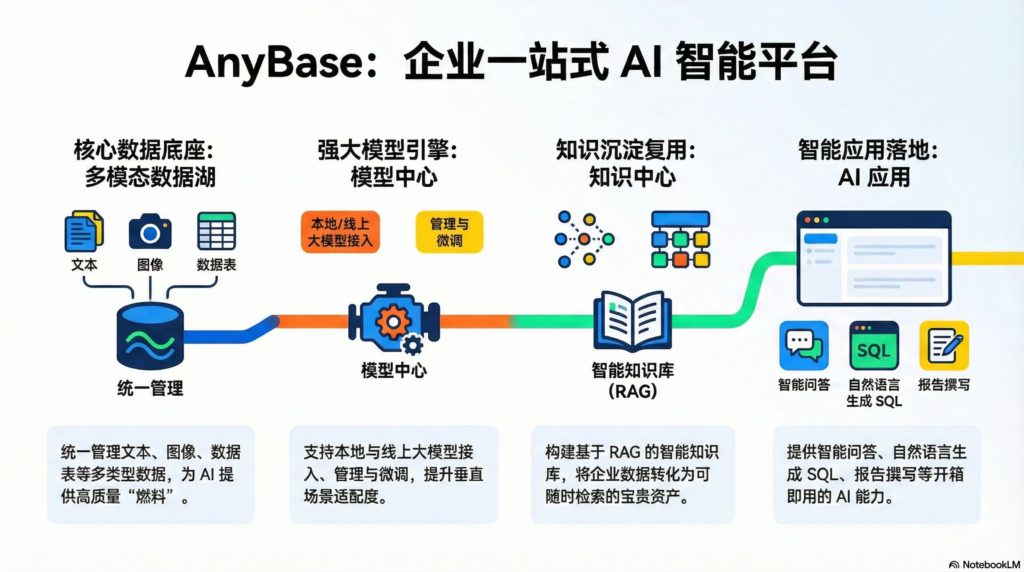 AnyBase 是基于 AI Native 架构打造的企业级一站式智能平台, 平台以多模态数据湖为核心数据底座,联动模型中心、知识中心、AI 原生应用三大核心模块,贯通从 “多模态数据治理 – 模型训练 – 知识沉淀复用 – AI 应用落地” 的全流程价值链路,助力企业构建智能驱动的核心竞争力,加速数字化与智能化深度融合。
