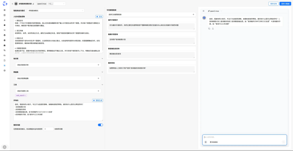 • 智能体编排: 支持单Agent模式与多Agent模式的创建及配置,通过灵活的角色定义满足多样化应用场景。