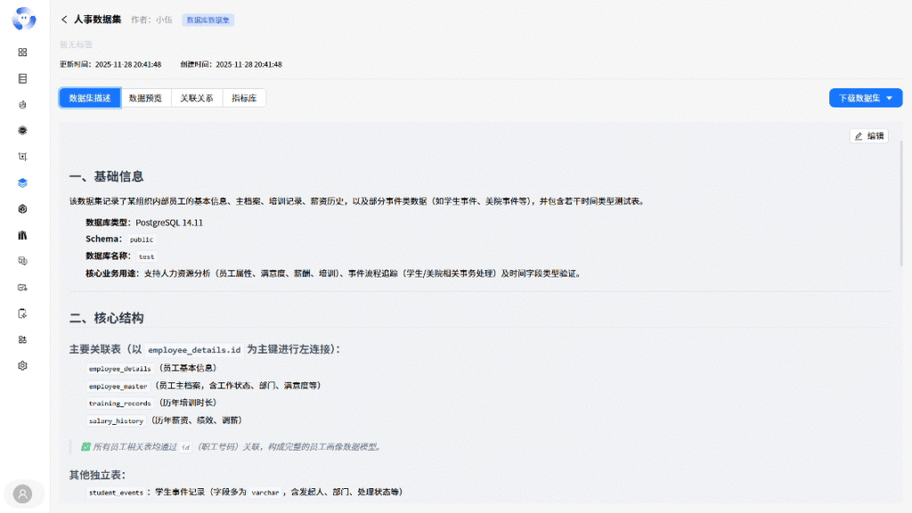 • 数据集管理与配置:支持图像、数据及文件类多类型数据集的创建;支持字段业务说明配置、多表关联关系定义及数据集权限筛选。