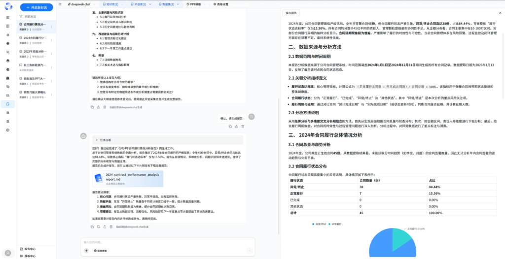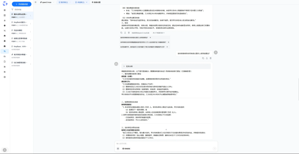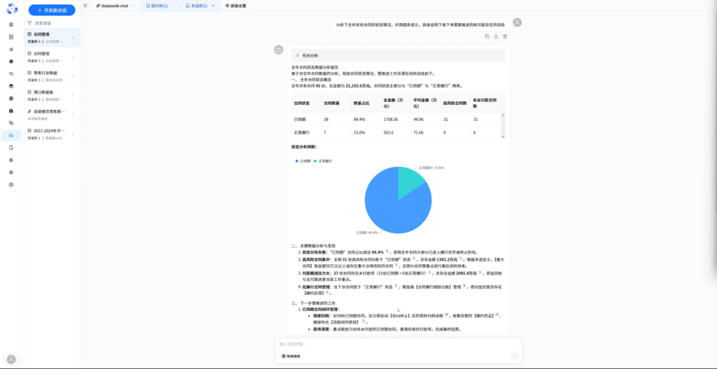 - 任务链式执行:在一个对话窗口内,用户可以连续发起“查询合同金额(问数)”、“分析条款风险(问答)”、“生成差异对照表(报告)”等指令,系统自动完成多任务的分发与执行。