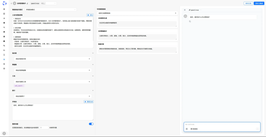 - 智能问数 Agent:通过关联数据集、知识库,让 Agent 具备对合同金额、期限等维度的统计、计算与筛选能力,基于知识内容提供准确分析。