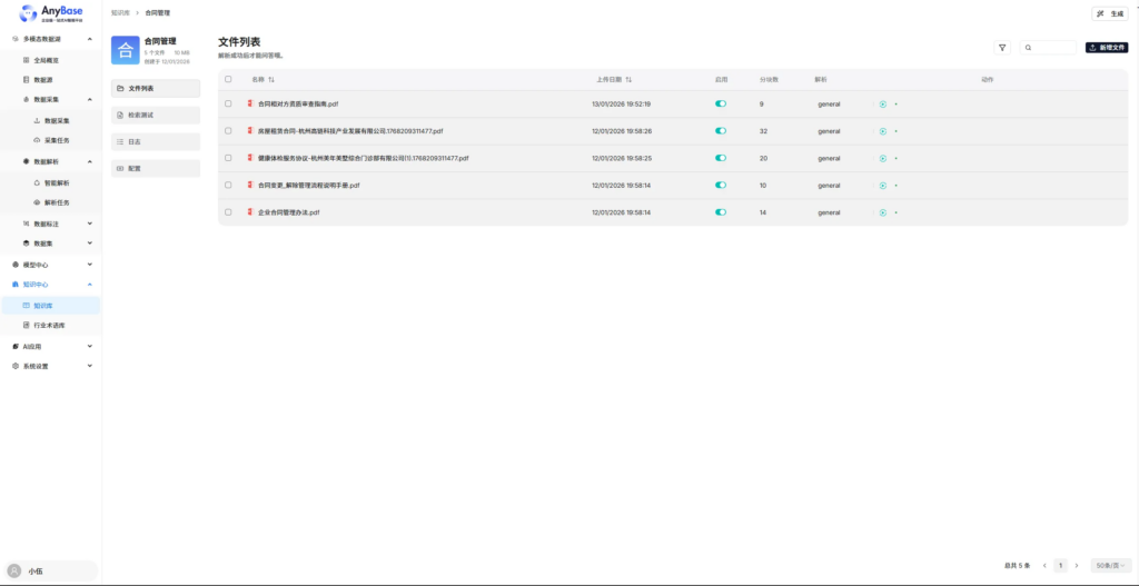 解析环节是“非标转标准”的核心。Anybase 支持用户通过自定义解析字段,将合同转化为结构化资产。